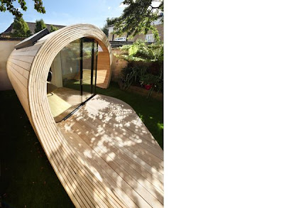 A lovely garden office by architects Platform 5 at the back of a 1950s terraced house in London's St John’s Wood with the brief "requiring the shoffice to be conceived of as a sculptural object that flowed into the garden space". Here's what they say about it: